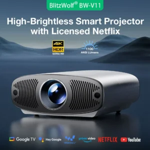 BLITZWOLF BW-V11 – 4K Projektor mit 1.100 ANSI Lumen, mit lizenziertem Netflix von Google TV, vollständig versiegelter optischer Motor, 4K-Unterstützung, natives 1080P HDR10, automatische Keystone-Korrektur, 20W Subwoofer, Surround-Sound