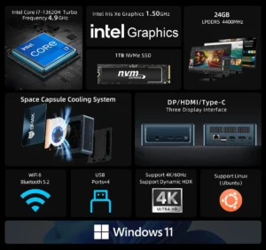 BMAX B10 Pro – Mini-PC mit Windows 11, Intel i7-13620H 10 Kerne CPU mit max. 4,9GHz, 24GB LPDDR5 RAM 1TB SSD, 4K-Triple Display: USB C + DisplayPort + HDMI, WiFi 6, Bluetooth 5.2, 2x USB 3.2, 2x USB 2.0, 1x 1Gbit RJ45 LAN, 1x Audio