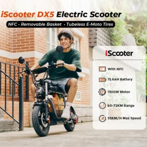 ISCOOTER DX5 – 15 Zoll Elektro-Roller, Sitz-Scooter mit 1500 Watt Motor, 48V 15,6Ah 748,8Wh Akku, Höchstgeschwindigkeit 55km/h, Reichweite 70km, max. Last 150kg, bis zu 25° Steigung, 15 x 3 Zoll Breit-Reifen
