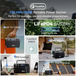 FLASHFISH BP030B – tragbare 300 Watt Powerstation, 230,4Wh LiFePO4 Akku, 600 Watt Spitzenleistung, AC-Ausgänge, Durchgangsladen, Solar-Generator für Camping/Haus-Backup/Notfälle/Off-Grid/Stromausfälle