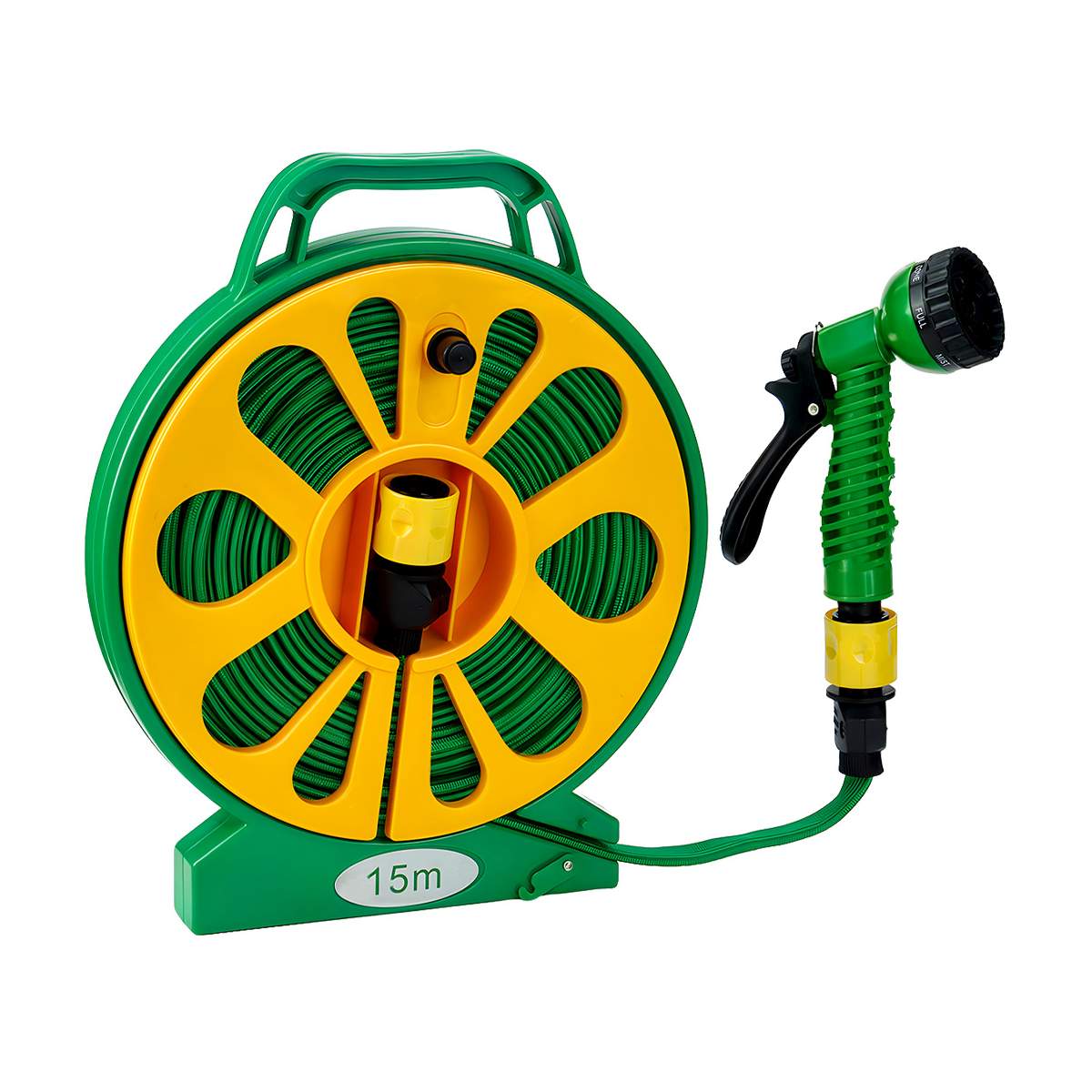 DRILLPRO 15 Meter Gartenschlauch, extra flache Bauweise mit Aufwicklungsstation, mit 5 Muster-Sprühdüse für 1/2 Zoll oder 3/4 Zoll Wasserhähne, perfekt zur Gartenarbeit und Reinigung