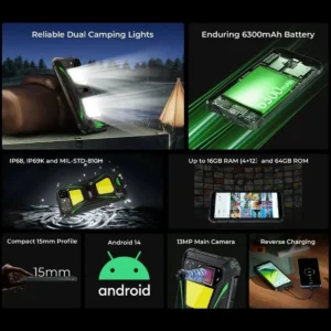 OUKITEL G5 – 6,0 Zoll LTE/4G Outdoor Smartphone mit Android 14, 4GB (+12GB virtuell) RAM + 128GB/256GB Speicher, 13MP & 5MP Kameras, 6.300mAh Akku, doppelte Camping COB Leuchte rückseitig, wasserdicht & schlagfest nach IP68/IP69K & MIL-STD-810H